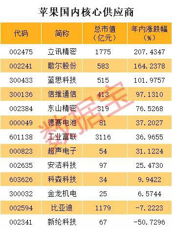 与此同时,苹果概念股也大幅走高。数据显示,今年内涨幅最大的苹果概念股是立讯精密,年内涨幅超过200%。同时,立讯精密也是兼苹果和华为的双概念股。