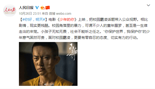 10月22日,《少年的你》突然宣布重新定档10月25日。这意味着,该电影完全没有宣传周期,对于主流观众来说,甚至很多人并不知道它突然定档的消息。