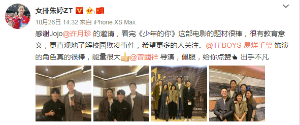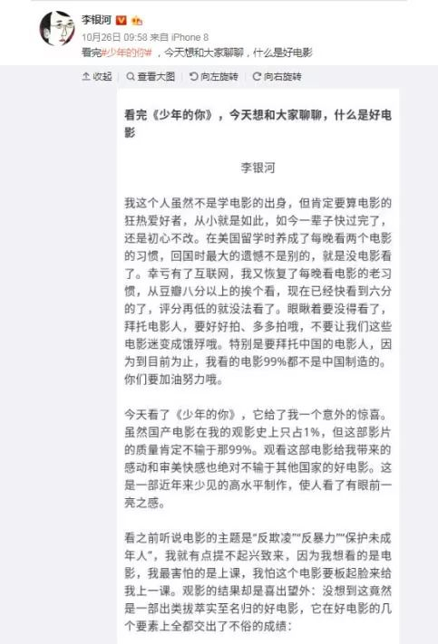 10月26日,著名社会学家李银河在微博发布长文,称《少年的你》给了她一个意外惊喜。她认为,《少年的你》在好电影的几个要素上全都交出了不俗的成绩——故事逻辑清晰、环环相扣,可信的人物关系,演员有上佳的表演。她极力向大家推荐这部影片。