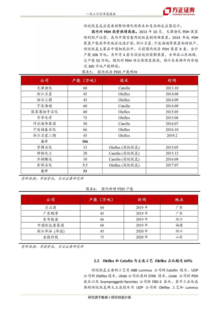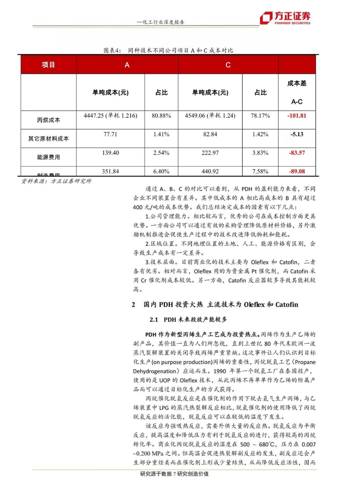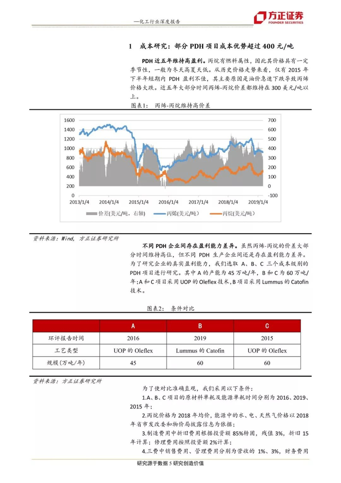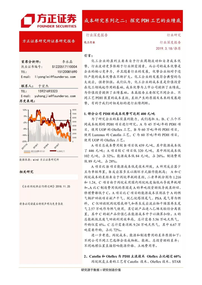 本文摘自方正证券2019年03月19日已发布的方正证券研究所研究报告《成本研究系列之二:探究PDH工艺的业绩底》