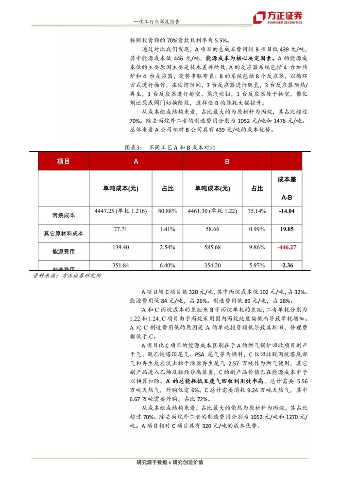 进一步考虑,丙烷成本、能源和制造费用的差异原因如下:不同公司不同工艺选择会造成物耗、能耗、总投资额的差异;不同地理位置直接影响能源价格、土地费用等。