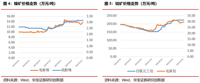 钴价在触碰到31.4万元/吨的高点后小幅回调,上周价格小幅回暖,短期估价回调原因为嘉能可近期与中国的GEM签署了氢氧化钴供应协议,而与其他中国买家的谈判也正在进行;中国供应商近期降低了金属钴的报价,以寻求在合同谈判中获取更低的价格;此外由于8,9月钴价触底反弹,部分厂商增加原料库存,当前库存水平保持在安全水平。长期看由于动力电池下游需求并未能承接市场的供应端,未来难以保持前段时间的疯涨状态,但随着10月份电池大厂的订单环比增加,以及四季度数码电池的需求持续增长,供给端嘉能可Mutanda停产时间为2020-21年,短期来看对19年供给影响不大,但长期来看下游数码电池的需求增长和动力电池的需求复苏,钴的供需平衡可能打破,长期来看钴价依旧保持上行趋势。上周钴价报在29.5万元/吨,相比上一周回升0.8万元/吨。