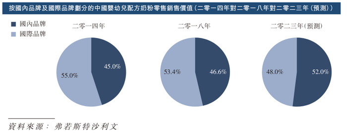 2008年三聚氰胺事件的发生使国内品牌遭受相当程度的冲击,国际品牌占据了更多的市场份额。近年来,国内品牌市场份额逐渐反弹,并预计在2023年前实现国产品牌对国际品牌的超越。18年国际品牌及国内品牌份额分别达53.4%及 46.6%,预计2023年国内品牌市占将达52%,实现对“洋品牌”的份额超越。
