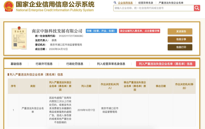 系统显示,南京中脉被列入“黑名单”的原因是“因发布虚假广告两年内受到三次以上行政处罚的,或者发布关系消费者生命健康的商品或者服务的虚假广告,造成人身伤害的或者其他严重社会不良影响的”。
