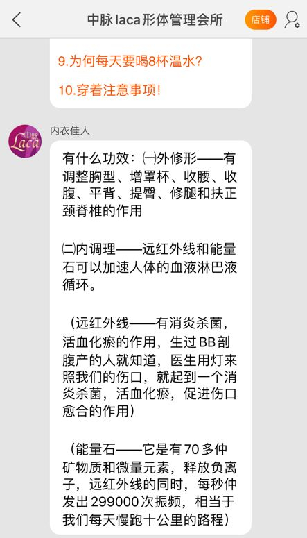 在线上,一家名为“中脉laca形体管理会所”的店铺客服称,该品牌的内衣内含远红外线和能量石,不仅可以起到一般内衣的调整功效,还可以扶正颈脊椎,甚至能够活血化瘀、促进伤口愈合。在店内,最便宜的形体衣约5000元左右,最贵的数万元。