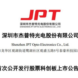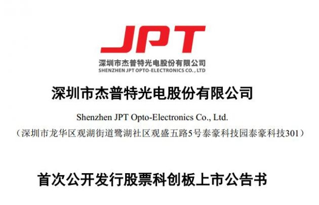 【TechWeb】10月30日消息,拟在上交所科创板上市的深圳市杰普特光电股份有限公司(以下简称“杰普特”,股票代码688025)发布了首次公开发行股票科创板上市公告书。该公司在公告书中表示,其股票将于2019年10月31日在上海证券交易所科创板上市交易。