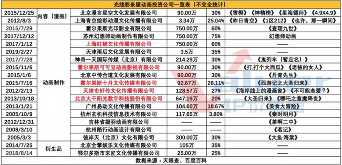 此后,光线在霍尔果斯注册了“彩条屋影业有限公司”,并至今投资了至少22家公司,涉及内容开发(漫画)、动画制作和衍生品开发几部分内容,即动漫产业链的上、中、下游,其中以动画制作公司为主。