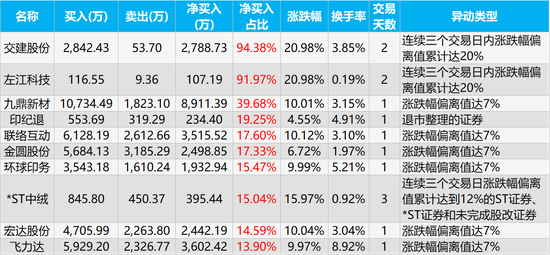 龙虎榜净买入占比最高的三只股票是交建股份、左江科技、九鼎新材,净买入金额为2788.73万元、107.19万元、8911.39万元,净买入占比分别为94.38%、91.97%、39.68%。