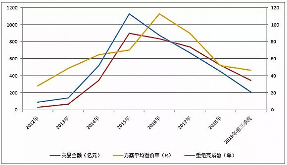 2016年以来,随着监管政策导向的转变和市场自身对于重组功能认识的不断深入,活跃度有所下降。越来越多的公司着眼于实际发展需求,而非资本市场工具的简单运用,更加合理谨慎地实施并购重组。此外,在市场日趋理性、IPO分流以及股价波动等因素的影响下,高溢价方案明显减少。