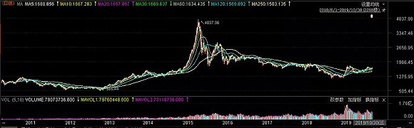 2010年6月1日至2019年10月30日创业板指数走势图。截图来源:choice数据