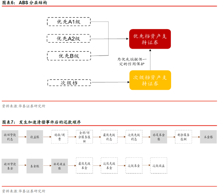 通过优先/次级的产品分层方式构建不同信用风险的品种。在发生加速清偿事件时,优先档本金的偿还处于优先地位,次级档收益不再被考虑,以保证各优先级本金的支付。