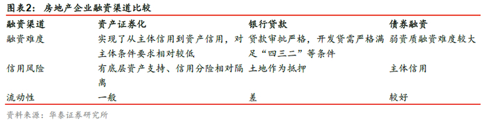 房地产资产证券化融资形式相比信贷、债券等融资方式更为灵活多变。在融资难度上,资产证券化产品通过将基础资产与主体风险隔离,并通过信用分级、超额覆盖、不动产资产抵押、连带责任担保等增信的方式,缓解低信用评级主体的融资难度;