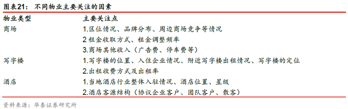 在物业业态方面,写字楼的运营方和租户之间有租赁合同,合同期限内现金流较易预测且相对稳定;商场与写字楼的情况类似,但有一定比例是与业绩相关的浮动租金;酒店的房价波动大、客户群体分散,现金流相对难预测。