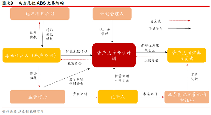 购房尾款ABS 是指以销售商品房对购房人享有的应收账款债权作为基础资产发行的ABS 产品。在购房尾款ABS模式下,分期购房过程中,从支付首付到完成贷款审批,大约间隔3-6个月,房企为了加速资金周转和优化财务状况,将购房尾款进行证券化。