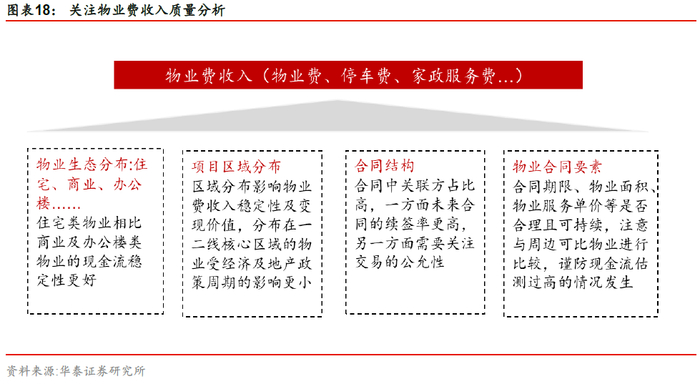 通常,住宅类物业相比商业及办公楼类物业的现金流稳定性更好;项目区域分布在一二线核心区域的物业受经济及地产政策周期的影响更小;物业的所处区位及周边配套影响物业费的单价。