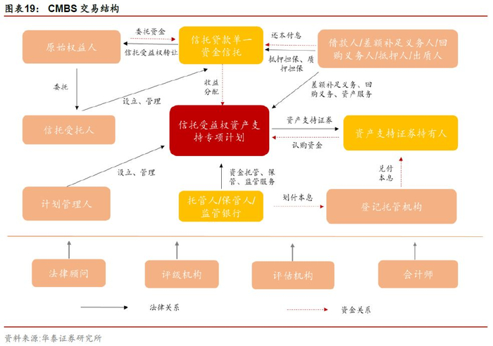 CMBS通常采用双SPV结构,原始权益人作为过桥资金提供方,通过设立信托计划通道为融资方提供贷款,底层资产是原始权益人通过信托通道的委托贷款收益权,同时,商业地产作为抵押,增信方进行增信。