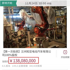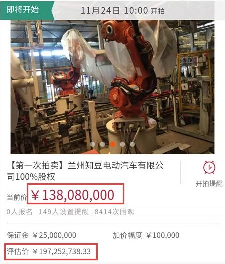阿里司法平台上的拍卖信息显示,此次被拍卖的兰州知豆100%股权,包含建筑厂房、整车生产线设备、土地使用权等资产。