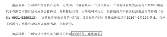 拍卖公告中,浙江省宁波市中级人民法院特地标明“拍品瑕疵”为:公司仍在经营,资产会有一定变动,甘肃省政府、兰州市政府、兰州新区管理委员会与兰州知豆曾签订过合作协议,对具体经营有一定限制和约定,具体可向兰州新区经济发展局等部门咨询。