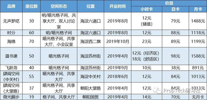 北京部分共享自习室价目表 来源:PropTech研习社制图