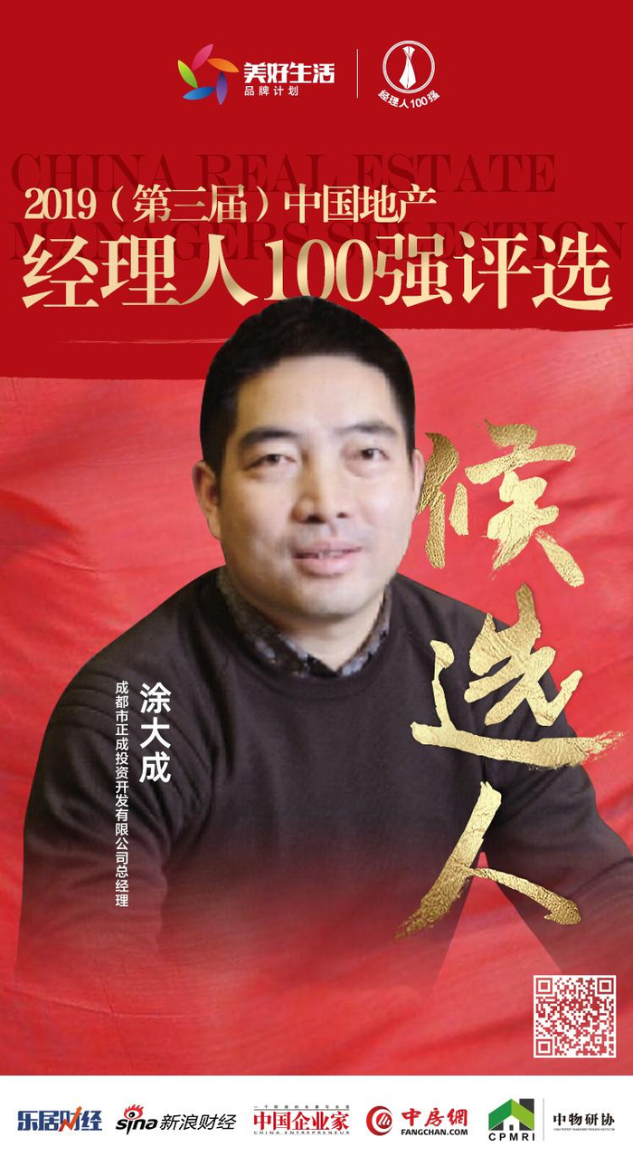 乐居财经讯 由乐居财经、新浪财经、中国企业家、中房网、中物研协联合主办,中国房地产业协会、中国物业管理协会、全国工商联家具装饰业商会的共同指导,2019(第三届)中国地产经理人评选于10月10日正式启动。10月31日,成都市正成投资开发有限公司总经理涂大成获媒体提名,成为“2019中国地产经理人100强”候选人。