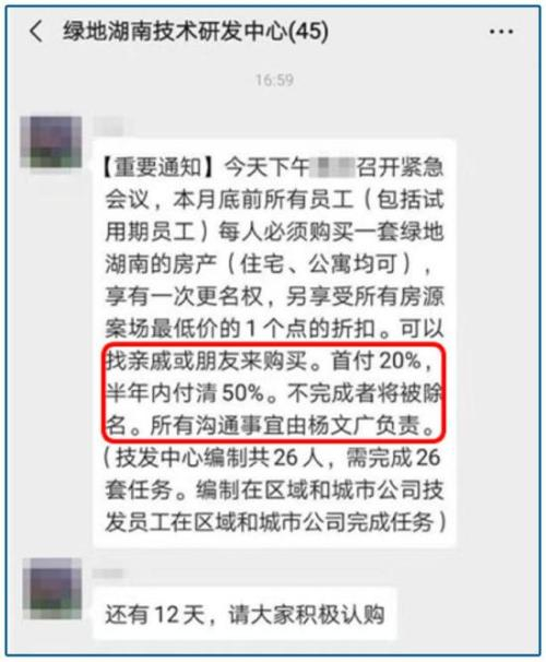全员营销已经成为市场促销的标配手段了,还有让员工全员买房子的。10月下旬,就屡有传出绿地湖南事业部要求员工购房,管理层带头,“不完成者将被除名”。