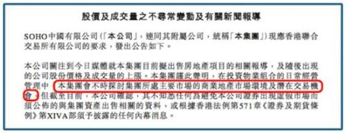 在市场传闻和股市异动的情形下,SOHO中国发了一则公告,“澄清一下传闻”,目前还没有什么需要公布的资料和内容,但是“本集团会不时探讨集团所处主要市场的商业地产市场环境及潜在的交易机会”。