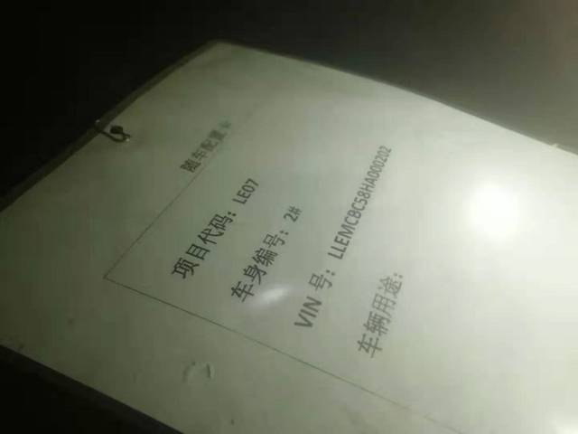 其中,一辆显示标记为“①首台车号202”的乐视汽车挡风玻璃下,存有一张“随车配置卡”。卡内的项目代码“LE07”,与车内放置的“LE07样车高压安全注意事项”,都在验证着该车“LE07样车”的身份。