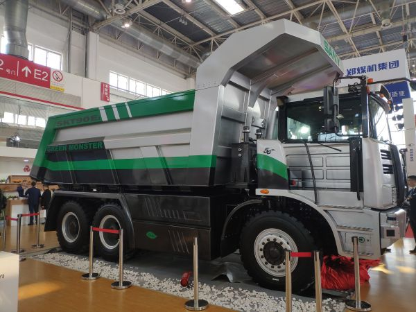 相比航天重工的轻量化巷道矿用车,三一重工推出的SKT90E纯电动无人宽体自卸车(保留驾驶室用于人工调试、检修),则是一款适用于露天矿山开采及石料、冶金、水利、水泥、建筑等行业物料运输的“大块头”。从现场目测来看,该车比2名成年男子还高一头,真正是外形威猛、气势逼人,难怪三一重工给它起了个“绿色猛兽”(Green Monster)的绰号。