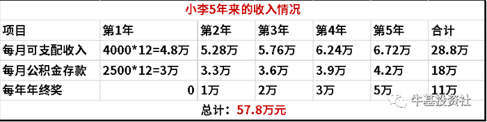 此外,小李还有一笔“隐形”的存款,那就是公司为他交付的住房公积金。按照小李的收入水平,这笔公积金(包括企业帮忙缴纳的部分和自缴的部分)大约在2500元,可以在5年后一次性提出,作为首付的款项补充;