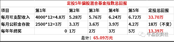 以偏股混合基金指数为例,假设小李将每月的可支配收入与年终奖都定投于偏股混合型基金指数,那么坚持5年后他的回报为:
