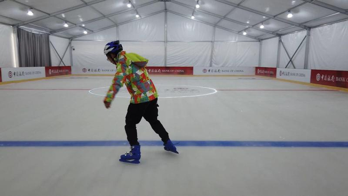 刚走进冰上体验区,记者立即感受到一阵凉意。冰上体验区设置了一块600平方米的滑冰场,可供体验者零距离接触滑冰这一项传统奥运项目。
