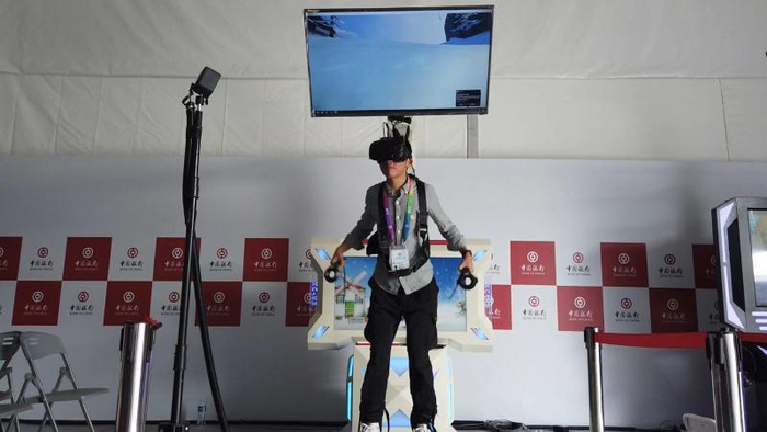 对于尚未熟练掌握滑雪和滑冰技巧的参观者来说,沉浸式VR体验区或许是最合适的选择。VR体验区设置了11台不同的互动体验设备,每台设备的游戏体验均不同。为确保参观者的安全,个别设备还特意设置了安全绑带,以防体验时出现跌倒等情况。“VR体验并非适合所有的人,比如对3D游戏容易产生眩晕感,以及佩戴大框眼镜的人,就不太建议体验了。”工作人员提醒说。