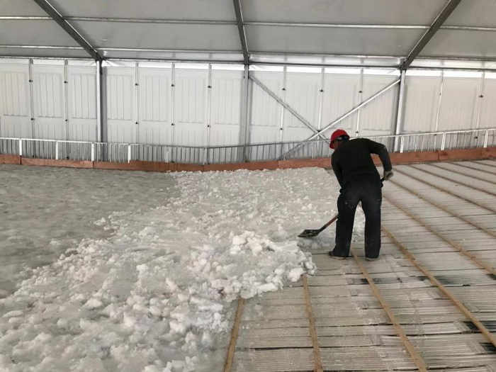 于是,真空造雪机昼夜不停工,施工人员分成早晚两班,一分一秒不敢耽搁。记者在现场发现,施工人员一人用推车等待造雪的同时,另一人在雪场铺雪,等推车里的雪装满后两人就交替工作,轮番上阵就是为了提高效率。