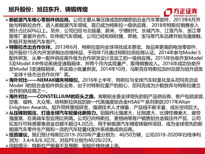 投资建议:我们预计特斯拉2019-2020年产量分别为:40/50万辆,公司2018-2020年归母净利润为:3.4/4.8/6.3亿元,对应PE分别为40/28/22X。
