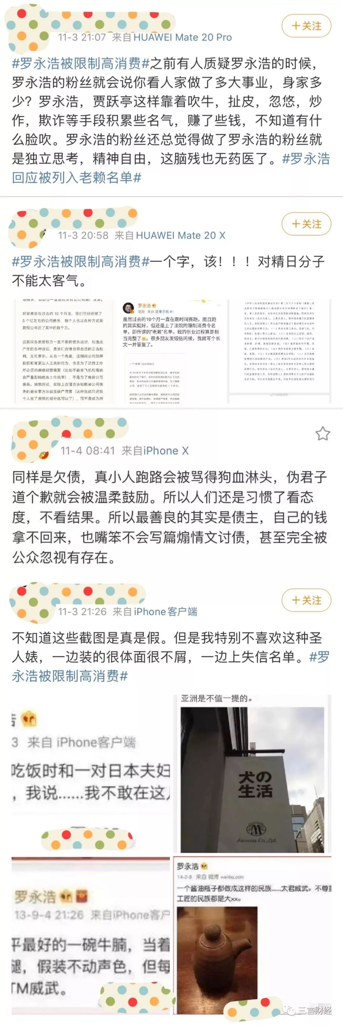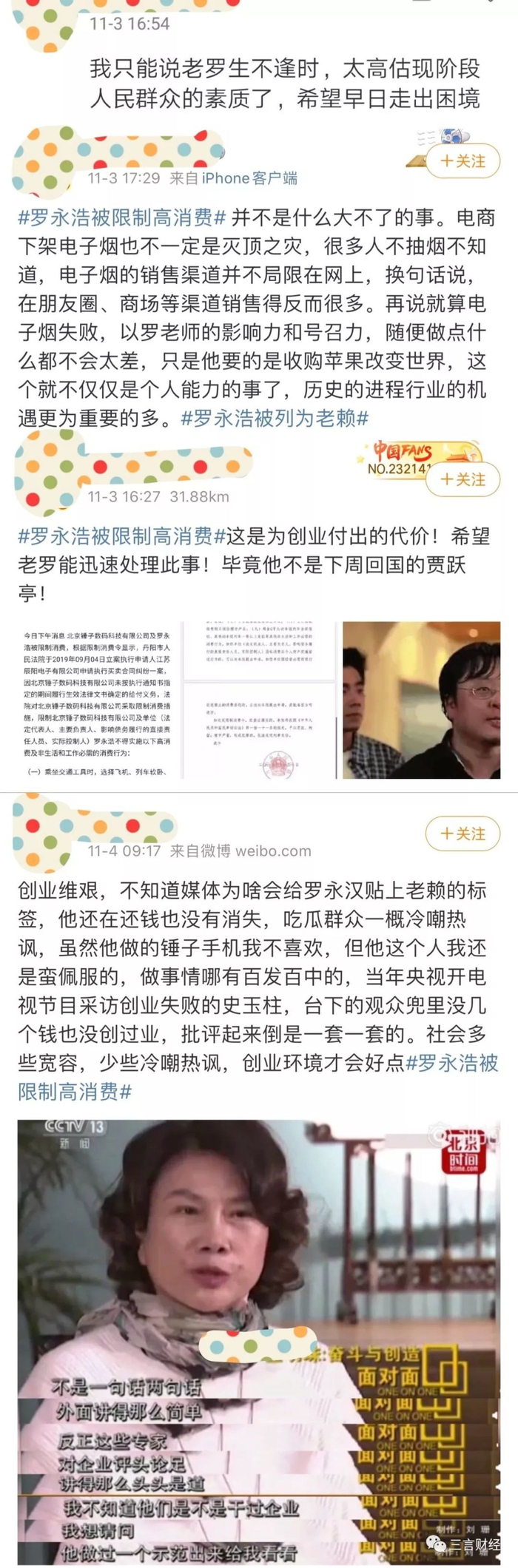 罗永浩被限制消费后,于11月3日下午发微博长文回应成为“老赖”。