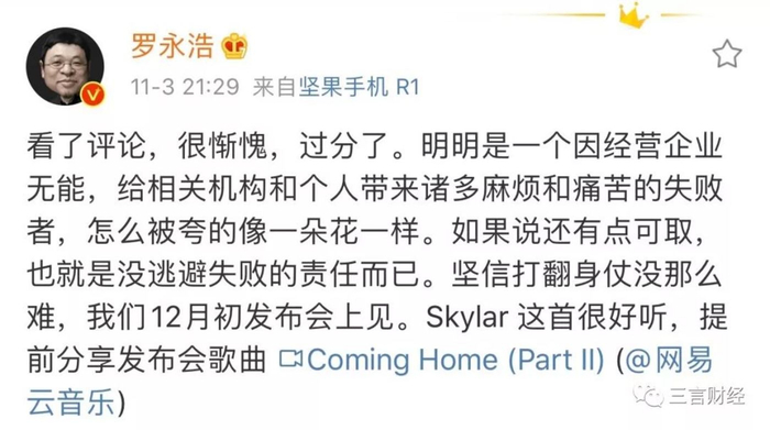 这点连罗永浩自己也不否认,11月4日,老罗再次发微博表示,“明明是一个因经营企业无能,给相关机构和个人带来诸多麻烦和痛苦的失败者,怎么被夸的像一朵花一样。如果说还有点可取,也就是没逃避失败的责任而已”。