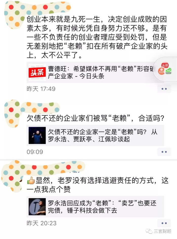 当然,也有网友在微博、朋友圈中对老罗成为“老赖”一事持不同看法。