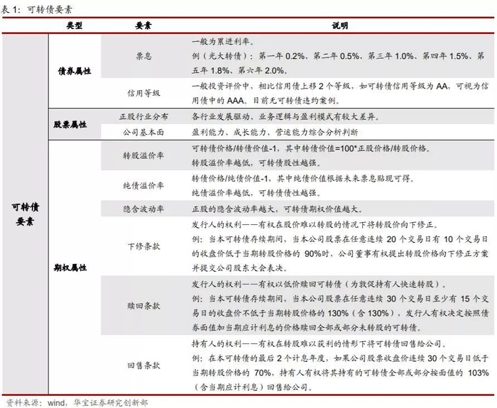 在投资可转债市场之前,有必要准确把握可转债的要素。根据可转债内含的不同属性,可对可转债要素进行分类:1)债券属性:包括票息、信用等级;2)股票属性:包括正股市值、行业、估值、公司基本面;3)期权属性:包括转股溢价率、纯债溢价率、隐含波动率、下修、赎回及回售条款。