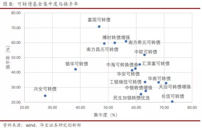 以上几个维度主要是从持仓风格角度研究,接下来我们用集中度和换手率两个指标分析基金的操作风格。集中度指标选取基金前五大可转债仓位之和在可转债总仓位中的比例,比例越高,集中度越大;换手率选取基金某季度可转债持仓中非保有前一季度持仓的比例进行估算,比例越高,换手率越大。结果表明,长信可转债、天治可转债、华商可转债平均集中度较高,平均换手率均属偏低水平,倾向于长期持有正股优质的个券,等待转股带来的收益;富国可转债、博时可转债平均集中度较低,平均换手率属偏高水平,倾向于分散个券,积极抓取市场机会获利。