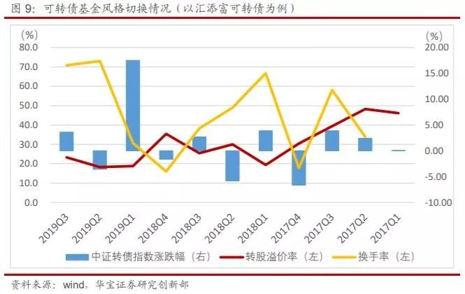 更进一步地,我们可以观察可转债基金在不同市场阶段下风格转换的情况。以汇添富可转债为例,2017年上半年转股溢价率较高,组合呈现出偏债性,三季度组合持仓变化较大,之后转股溢价率显著降低,组合开始以平衡性为主。2019年一季度转债市场上涨,基金换手不高,而转股溢价率明显降低至20%,具备一定股性,体现出在前期选券中重视较低估值和良好基本面带来的弹性,而与其他可转债基金相比,该转股溢价率处于中等水平,属于相对稳健的组合。2019年二季度基金换手较高,体现对转债市场大涨后的市场相对审慎。可以看出汇添富基金2017年下半年以后稳定维持平衡性为主的投资策略。