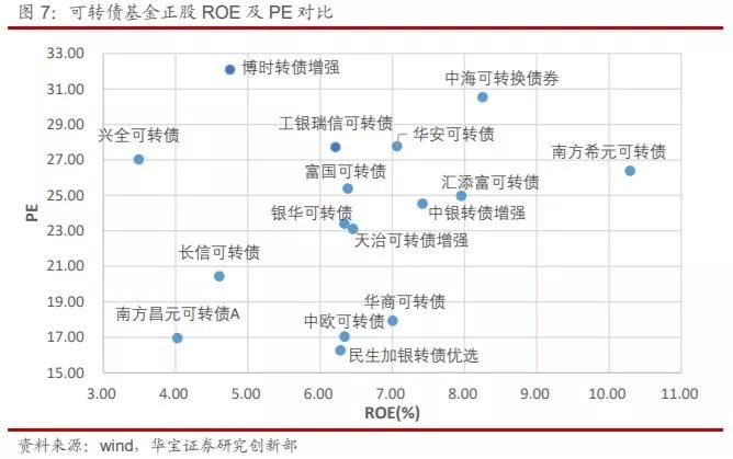 从结果上看,ROE方面,南方希元可转债、中海可转债、汇添富可转债正股ROE相对较高,反映它们在标的选择上对于正股盈利能力较为注重,兴全可转债、南方昌元可转债、长信可转债正股ROE水平则较低;估值方面,博时转债增强、中海可转换债券正股PE相对较高,而民生加银转债精选、南方昌元可转债、中欧可转债的正股估值较低。理论上ROE越高,反映企业盈利能力较强,基本面良好,市场会给予一个较高的估值,下图中整体呈现出这一状况,但也可以看出汇添富可转债、华商可转债等基金拥有较高的正股ROE和相对较低的正股估值。