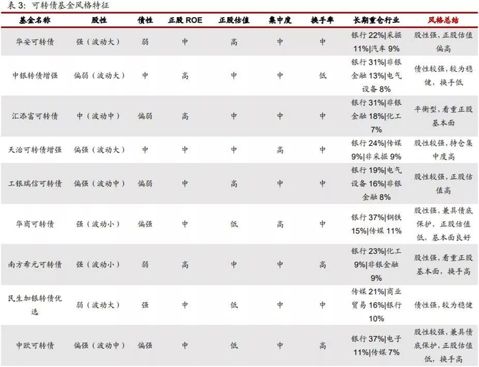由于每季度披露可转债持仓相对完整,可转债基金的分析相比一般债基拥有较为充足的数据。可转债基金的风格判断与前述可转债本身的要素和特征息息相关。我们基于基金季度持仓数据,从多个维度分析可转债基金风格:1)股/债性:根据持仓比例加权,可以计算出组合的转股溢价率以及纯债溢价率;2)组合正股ROE及估值;3)组合正股行业分布;4)持仓集中度及换手率。