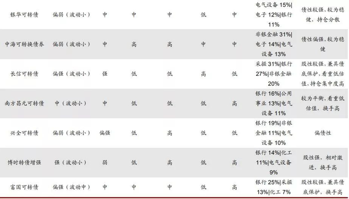 根据某只基金任职期各季度的可转债持仓数据,统计基金各季度可转债正股在各行业的分布比例,再将各季度的比例进行平均,可以得到基金的平均行业分布情况。通过观察各可转债基金的前三大重仓行业,可以发现大多数可转债基金第一重仓行业为银行,另外非银金融、电气设备、公共事业、化工也是多数基金重仓的行业。值得关注的是民生加银转债优选以传媒和商业贸易行业为主,银华可转债则以电气设备和电子行业为主,正股偏小盘风格。另外从行业集中度角度,汇添富可转债、华商可转债、长信可转债较为集中,前两大重仓行业比例之和超过50%,而南方昌元可转债、博时转债增强、银华可转债则相对分散。