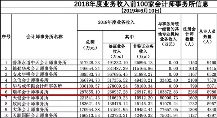 据中注协网站披露,2018年瑞华所的收入规模紧随“四大”和立信所之后,排名第六。但从目前情况来看,2019年的这一排名或将重新洗牌。
