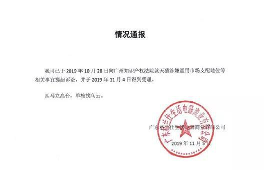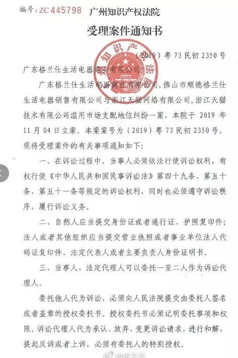 11月5日,格兰仕在官方微博发布情况通报称,已于2019年10月28日向广州知识产权法院就天猫涉嫌滥用市场支配地位等相关事宜提起诉讼,并于2019年11月4日得到受理。