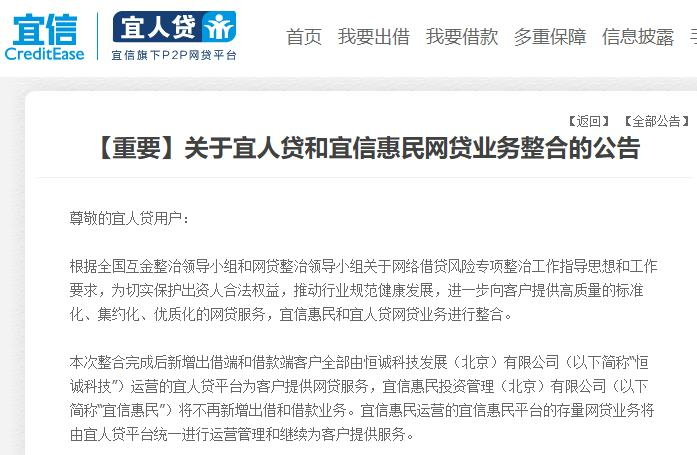 11月3日,上市公司宜信旗下网贷平台宜人贷发布《关于宜人贷和宜信惠民网贷业务整合的公告》,宣布将宜信惠民和宜人贷网贷业务进行整合。