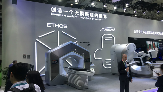 作为全球主要放疗设备供应商之一的瓦里安医疗公司在本届进博会中展示了亚太地区首发的EthosTM 智慧放疗平台,该平台在全球率先实现了多模态在线自适应治疗,在人工智能驱动下,具有将MR、CT、PET多模态影像自动融合的“超能力”,能够如影随形精准地捕捉肿瘤的动态变化(包括位置、大小、形状等),将自适应治疗时间压缩至15分钟,每一次放疗都为患者开出精准的、个性化的“4D处方”,尽可能地减少不必要的副作用。
