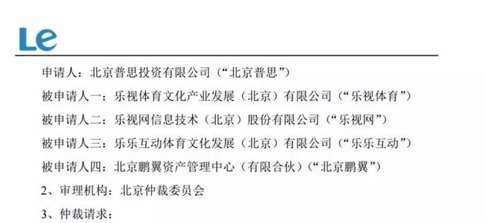 北京普思要求裁决乐视体育赔偿经济损失9785.16万元;裁决乐视网、乐乐互动、北京鹏翼对乐视体育在第一项仲裁请求中所负给付义务承担连带责任。