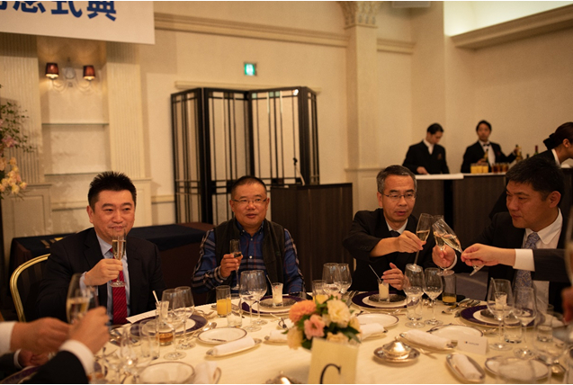 谢骏会长、欧阳文石大师(左二)、景春海参赞(右二)及社外取缔役薛立功(右一)举杯欢庆