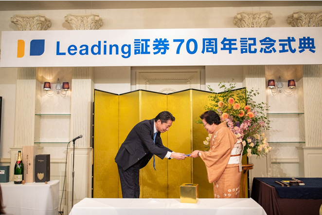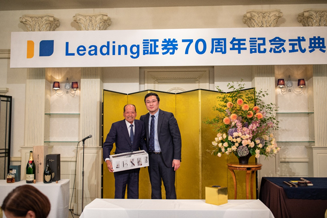 中国驻日大使馆景春海参赞、著名书法艺术家欧阳文石先生、株式会社Asian Star取缔役会长吴文伟先生等中日各界友人齐聚一堂,共同欢庆Leading证券七十周年纪念庆典。